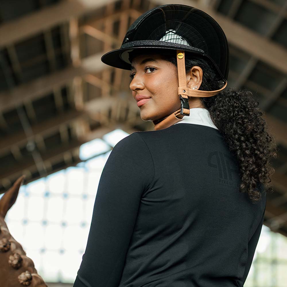 Hansbo Sport MIPS Vision Shiny Star to elegancki i bezpieczny kask jeździecki, który łączy nowoczesny wygląd z funkcjonalnością. Błyszczące wykończenie, szeroki daszek oraz brokatowe panele nadają mu efektowny, stylowy charakter. Kask został wyposażony w system MIPS, zwiększający poziom ochrony, a sześć otworów wentylacyjnych zapewnia optymalną cyrkulację powietrza.