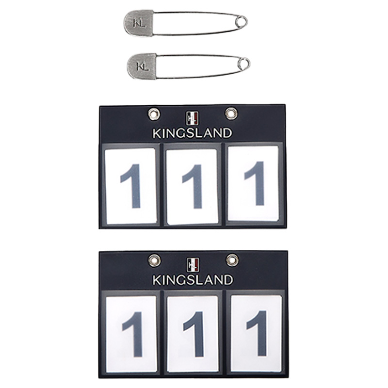 Granatowe, wysokiej jakości numery startowe od Kingsland, z wyjmowanymi numerami do łatwej regulacji. Numer startowy przyczepia się do podsiodłków lub sprzętu za pomocą dużej agrafki, elegancko opatrzonej logo KL.
