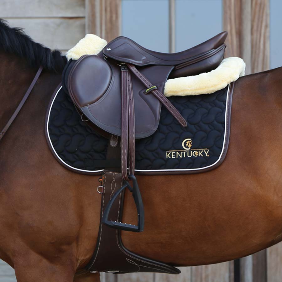 Podkładka Kentucky, model Absorb Logo, łączy styl i funkcjonalność. Sztuczna skórzana krawędź nadaje jej elegancki wygląd, a anatomiczny kształt zapewnia, że grzbiet nie jest narażony na ucisk i tarcie. Obejmuje tylko jeden paski nylonowy do popręgu, co ułatwia użycie. Ta podkładka nadaje się do skoków, ujeżdżenia i Wszechstronności, co czyni ją wszechstronną w różnych dyscyplinach. Dzięki cienkiej warstwie zapewnia doskonałą amortyzację między grzbietem konia a siodłem, zmniejszając ryzyko otarć. Można ją prać w pralce w 30 stopniach, co upraszcza konserwację. Zalecamy pranie tak rzadko, jak to możliwe, i używanie ochronnych worków do prania, aby zachować jakość na dłużej. Można ją łatwo wysuszyć na słońcu.