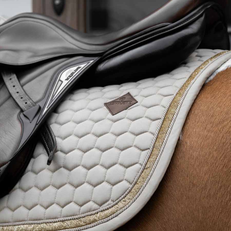 Czaprak Glitter Band od Kentucky Horsewear łączy elegancję i komfort dla jeźdźców, którzy chcą się wyróżnić. Z wyróżniającym się paskiem z brokatem i anatomicznym dopasowaniem, ten czaprak oferuje zarówno styl, jak i funkcjonalność. Wykonany z szybko schnącej mieszanki bawełny i poliestru z wzorem plastra miodu, zapobiega gromadzeniu się ciepła i zapewnia skuteczne amortyzowanie między siodłem a grzbietem konia. Zaprojektowany, aby idealnie pasować do grzbietu konia, łagodzi nacisk na kłąb i zapobiega przesuwaniu się lub ocieraniu. Dostępny w sześciu ponadczasowych kolorach oraz w modelach skokowych i ujeżdżeniowych. Aby zachować jakość, używaj ochronnego worka do prania podczas prania w pralce w 30°C i susz na powietrzu.