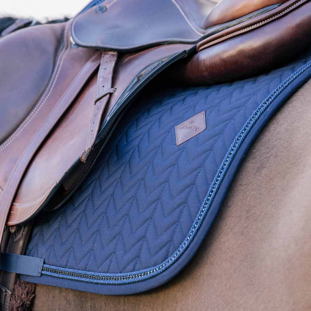 Czaprak z metalowym łańcuchem od Kentucky jest zarówno stylowy, jak i funkcjonalny, idealny do treningu i zawodów. Dzięki pikowaniu w kształcie rybiego kręgosłupa oraz iryzującemu brzegowi z metalowym łańcuchem, dodaje eleganckiego akcentu do Twojego sprzętu. Czaprak nie ma pasków do siodła, tylko pas do popręgu, co ułatwia jego użycie. Jego anatomiczny kształt uwalnia łopatki i minimalizuje nacisk oraz tarcie, co jest ważne dla komfortu konia. Dodatkowo, wykonany jest z materiału, który skutecznie pochłania wilgoć i jest bardzo oddychający, zapewniając doskonałą amortyzację między grzbietem konia a siodłem. Na lewej stronie znajduje się również skórzane logo, umieszczone na tyle wysoko, aby w razie potrzeby można było wyhaftować własne logo. Czaprak można prać w pralce w temperaturze 30 stopni, ale zalecamy pranie tak rzadko, jak to możliwe, aby zachować jakość. Najlepiej wysuszyć go na słońcu, powieszoną na zewnątrz.