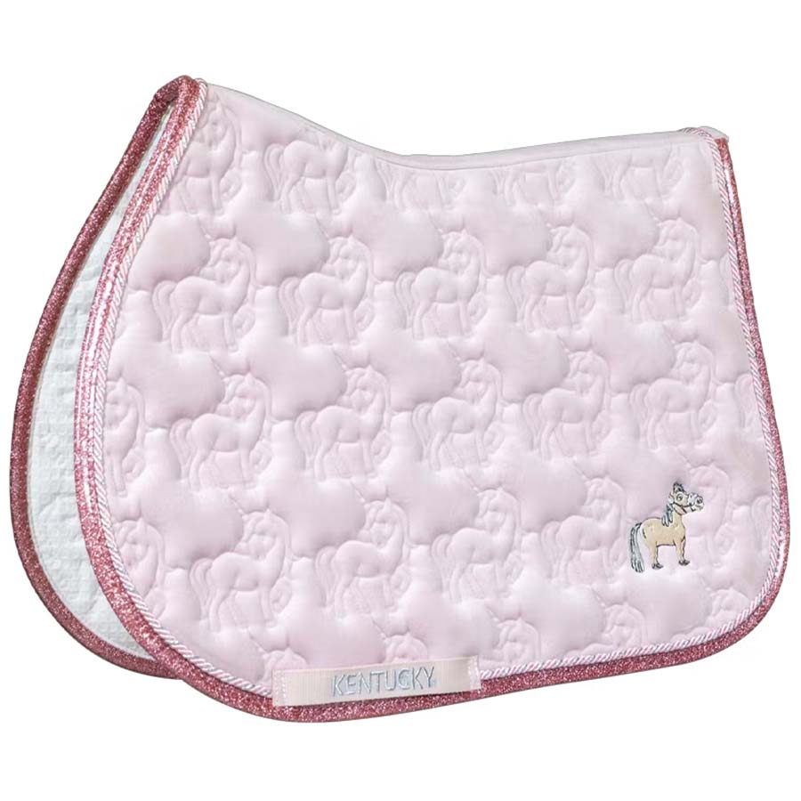 • Czaprak Unicorn Head Glitter marki Kentucky Horsewear wyróżnia się pikowanym wzorem z motywem małych głów jednorożców oraz błyszczącą lamówką w kolorze różowego złota, uzupełnioną uroczym logo Sammy jako subtelnym detalem. Czaprak ma anatomiczny kształt, który dopasowuje się do grzbietu konia i stabilnie leży pod siodłem.