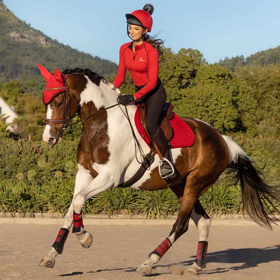 LeMieux Classic Close Contact Square to czerwony, wysokiej jakości czaprak skokowy, idealny do codziennej jazdy i startów w zawodach. Wykonany z poliestru przypominającego zamsz, oddychającej wiskozy bambusowej, amortyzującej pianki i stabilnego wypełnienia polyfill – dla maksymalnego komfortu i funkcjonalności.