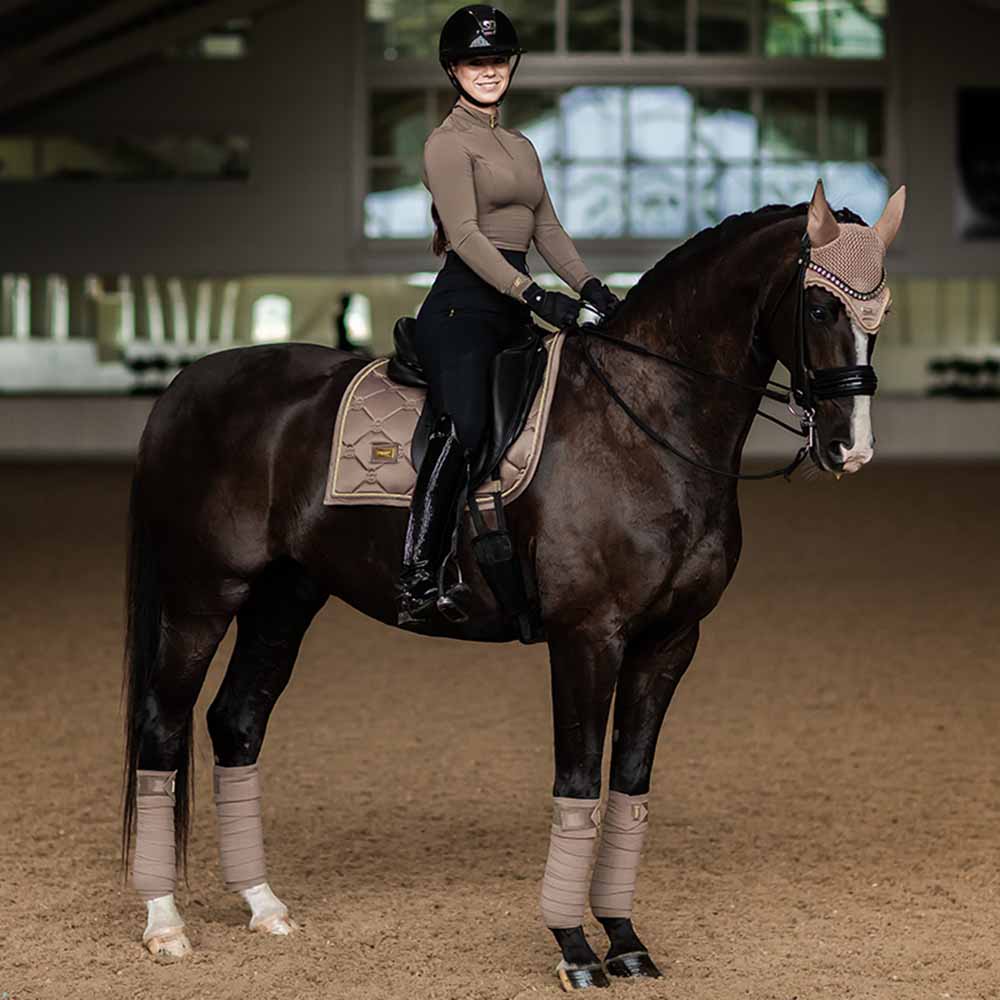 Ten elegancki czaprak ujeżdżeniowy w kolorze beżowym z złotymi detalami jest zarówno stylowy, jak i funkcjonalny. Wykonany w 100% z nie-recyklingowanego poliestru, jest traktowany technologią High IQ cool comfort, co zapewnia szybkie schnięcie i właściwości odprowadzające wilgoć. Pomaga to utrzymać twojego konia w suchości i świeżości przez dłuższy czas podczas jazdy. Świetnie komponuje się z innymi elementami z naszej kolekcji Champagne, tworząc kompletny i elegancki wygląd.