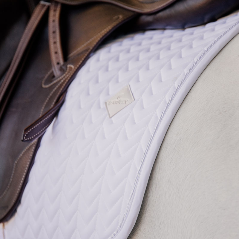 Czaprak ujeżdżeniowy z rybią ością zapewnia doskonałą amortyzację między grzbietem konia a siodłem, chroniąc także przed tarciem. Jego unikalne pikowanie w rybiają ość nie tylko oferuje stylowy wygląd, ale także zapewnia oddychalność, co jest istotne dla komfortu konia podczas jazdy. Ten czaprak nie ma pasków do siodła, tylko paski do napierśnika, co ułatwia użytkowanie i zmniejsza ryzyko przesuwania się. Subtelne logo ze skóry w tym samym kolorze co czaprak dodaje eleganckiego akcentu, a także jest wystarczająco dużo miejsca na haft, jeśli chcesz go spersonalizować.