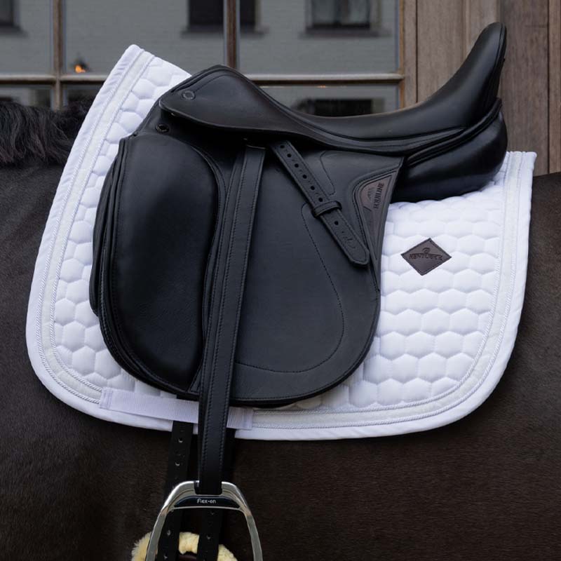 Czaprak ujeżdżeniowy Glitter Band marki Kentucky Horsewear w kolorze Biały/Biały to elegancki i funkcjonalny wybór dla jeźdźców ujeżdżeniowych. Z wyróżniającym się pasem z brokatem, ten czaprak przyciąga uwagę i dodaje wyrafinowanego akcentu zarówno podczas treningu, jak i zawodów. Jego anatomiczny kształt zapewnia idealne dopasowanie, redukując nacisk na kłąb i zapobiegając przesuwaniu się. Wykonany z szybko schnącej mieszanki bawełny i poliestru z wzorem plastra miodu, oferuje skuteczną amortyzację i oddychalność, aby utrzymać konia w komforcie podczas intensywnych sesji. Czaprak oferuje również miejsce na personalizowany haft, co pozwala na dodanie osobistego akcentu. Można go prać w pralce w 30°C i należy go powiesić do wyschnięcia, aby zachować jego kształt i jakość.