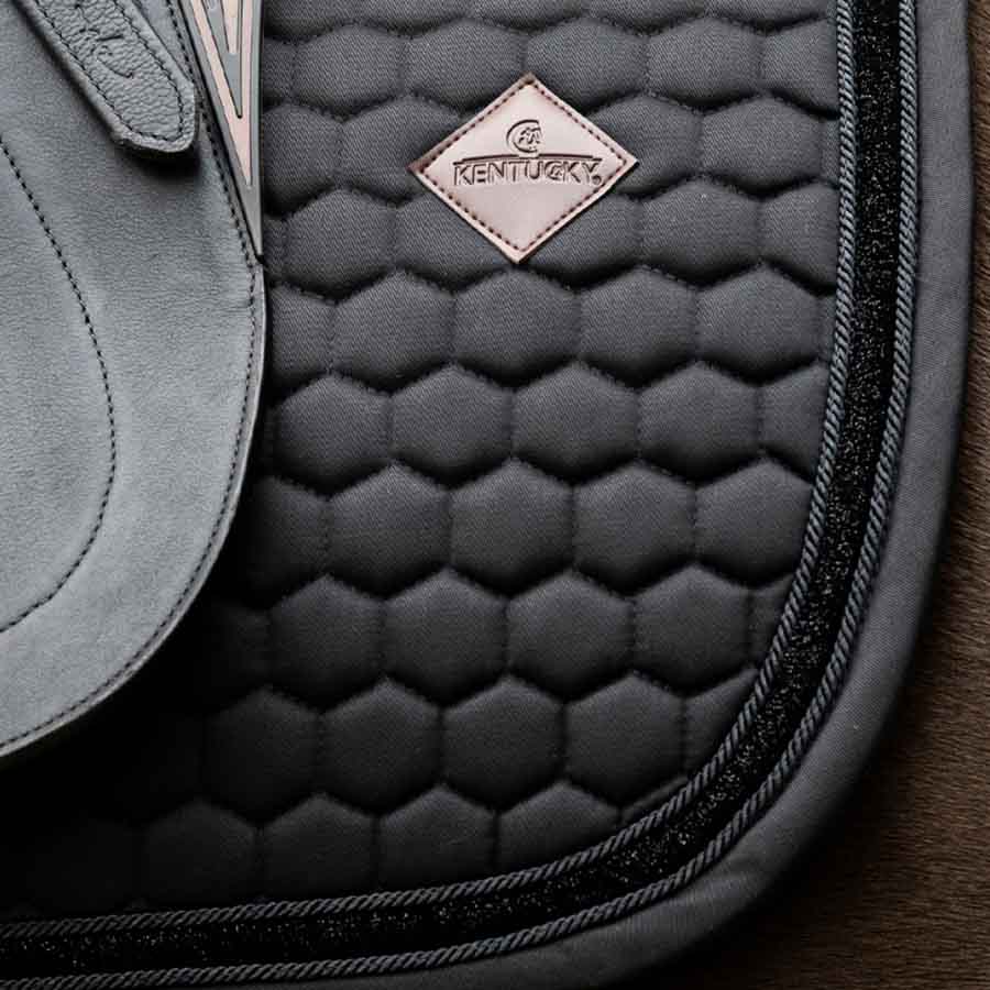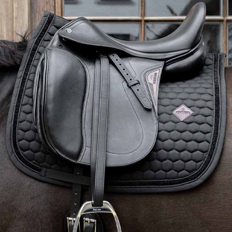 • Czaprak ujeżdżeniowy Glitter Band od Kentucky Horsewear łączy elegancję i funkcjonalność dla jeźdźców poszukujących stylu i komfortu. Ten czarny czaprak przyciąga uwagę swoim efektownym brokatowym paskiem i umożliwia szybkie, bezproblemowe siodłanie bez irytujących pętli na popręg. Wykonany z szybko schnących, oddychających materiałów, zapobiega gromadzeniu się ciepła i zapewnia bezpieczną jazdę dzięki anatomicznemu dopasowaniu, które zapobiega przesuwaniu się. Dodatkowo oferuje dużo miejsca na personalizowane hafty, dodając osobisty akcent.