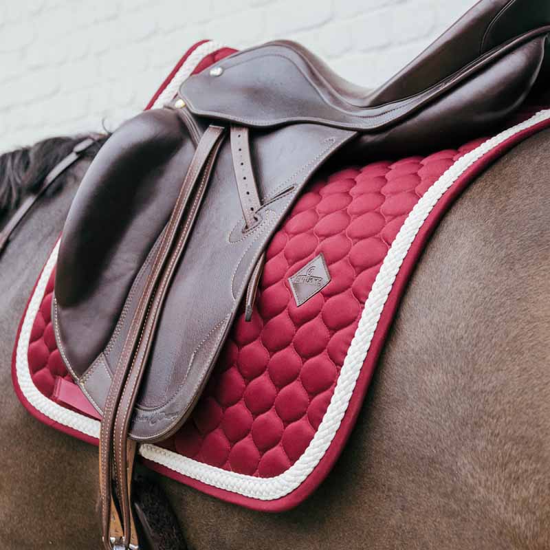Czaprak ujeżdżeniowy z plecionym sznurkiem od Kentucky łączy styl i funkcjonalność w skuteczny sposób. Charakteryzuje się klasycznym wyglądem z plecionym sznurkiem oraz unikalnym wzorem pikowania, który dodaje eleganckiego akcentu. Czaprak szybko schnie i jest bardzo oddychający, co czyni go idealnym do intensywnych sesji jeździeckich. Praktycznym szczegółem jest to, że nie ma irytujących pasków do przymocowania go do siodła, co upraszcza użytkowanie. Wnętrze czapraka ma strukturę gofrowaną, aby utrzymać go na miejscu i zapewnić amortyzację pod siodłem. Wykonany jest z mieszanki bawełny i poliestru, która skutecznie absorbuje pot. Aby utrzymać czaprak w dobrym stanie, zaleca się częstsze pranie, jeśli twój koń dużo się poci podczas treningów. Nie suszyć czapraka w suszarce bębnowej.