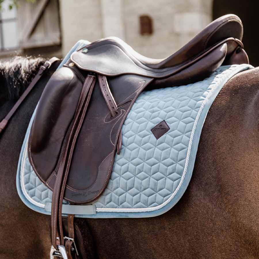 Czaprak ujeżdżeniowy Velvet jest zarówno stylowy, jak i klasyczny, z podwójnym skręconym obszyciem, które dodaje eleganckiego akcentu. Posiada pikowanie w kształcie gwiazdy, które nie tylko dobrze wygląda, ale także zapewnia doskonałe amortyzowanie między grzbietem konia a siodłem, chroniąc przed tarciem. Ten czaprak jest dostosowany do ujeżdżenia i nie ma irytujących pasków do mocowania do siodła, tylko nylonowy pasek do popręgu. Subtelne logo z sztucznej skóry umieszczone jest centralnie i nieco wyżej, zawsze pozostawiając miejsce na haft własnego logo, jeśli zajdzie taka potrzeba.