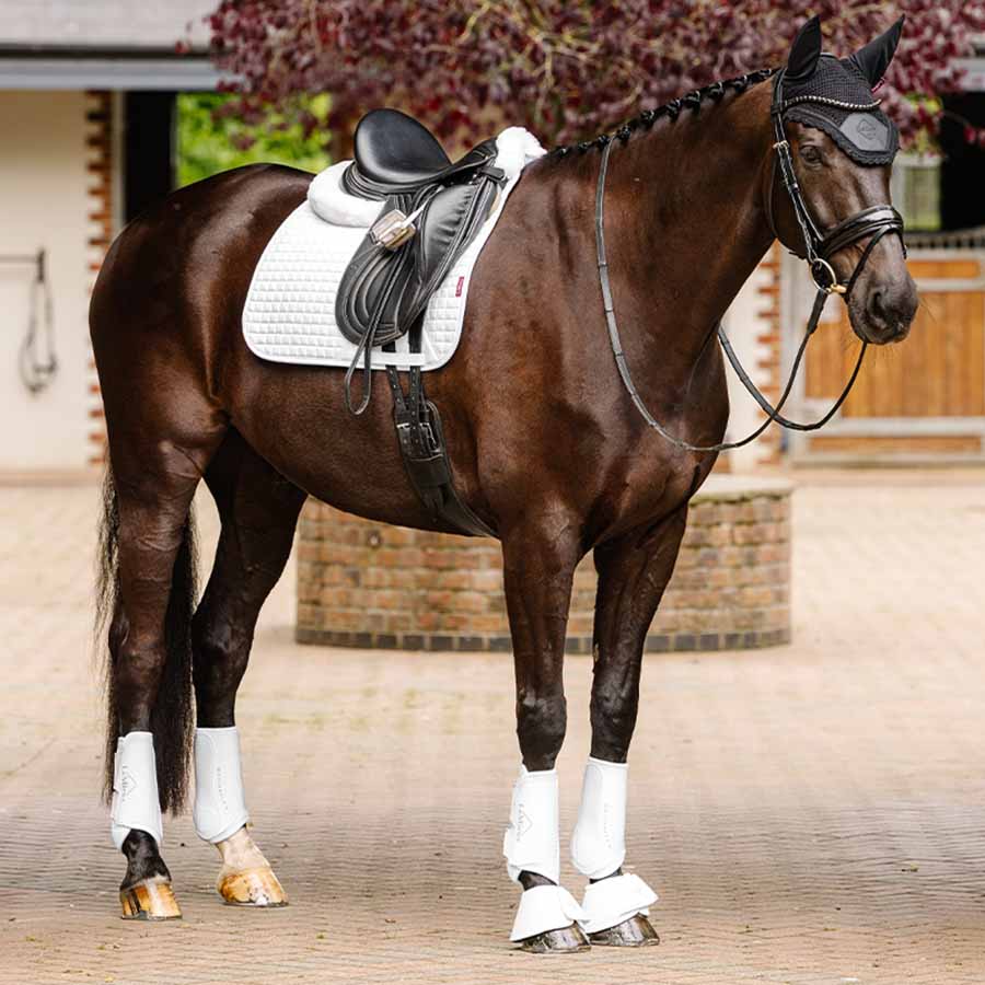 LeMieux Classic Suede Square to czarny czaprak ujeżdżeniowy o eleganckim wyglądzie i przemyślanej konstrukcji – idealny do codziennych treningów i startów w zawodach. Wykonany z poliestru imitującego zamsz, wiskozy bambusowej, waty poliestrowej i amortyzującej pianki dla maksymalnego komfortu i trwałości.