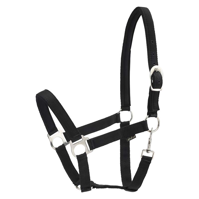 Prosty, czarny kantar z metalowymi elementami w kolorze srebrnym i karabinkiem. Wypełniony w okolicy nosa i kołnierza do derki dla optymalnego komfortu, oraz z regulowanym paskiem na kołnierz, który pozwala na łatwe dopasowanie kantara do twojego konia.