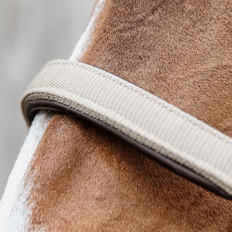 Anatomicznie wyprofilowany pasek potyliczny zapewnia większy komfort dla konia, a regulacja za pomocą dwóch sprzączek umożliwia precyzyjne dopasowanie. Kantar wyposażony jest również w tabliczkę, którą można odwrócić i wygrawerować.
