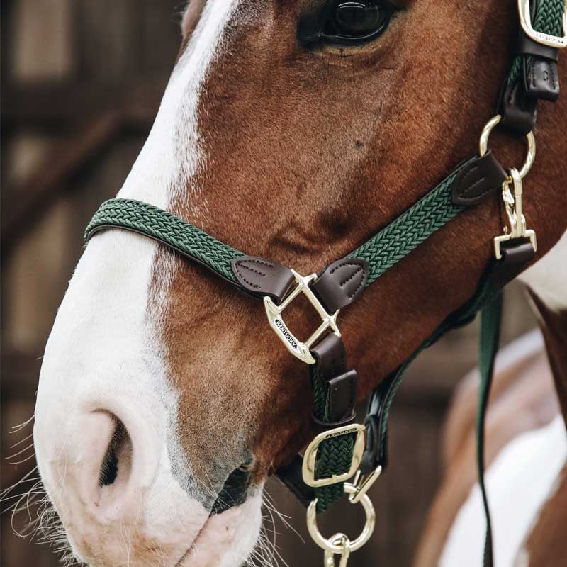 Kantar posiada regulację z boku oraz pod brodą, co umożliwia dobre dopasowanie do różnych typów głów. Złote okucia nadają elegancki wygląd i dobrze komponują się z uwiązami Kentucky. Model dostępny w wielu wariantach kolorystycznych.