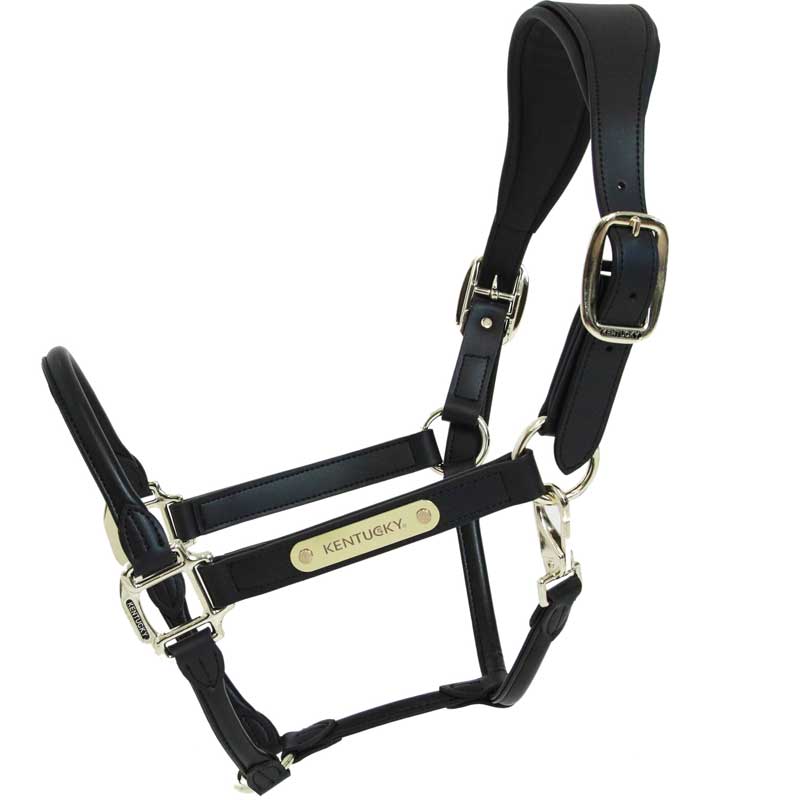 Konstrukcja została zaprojektowana z uwzględnieniem anatomii konia – szeroki pasek potyliczny równomiernie rozkłada nacisk, zapewniając większy komfort niż w przypadku standardowych, węższych modeli. Regulacja po obu stronach umożliwia precyzyjne dopasowanie. Kantar wyposażony jest w złoconą tabliczkę z logo Kentucky, którą można odwrócić i wygrawerować.