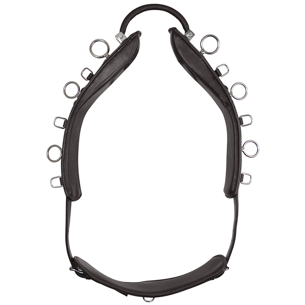 Model wyposażony jest w srebrne okucia oraz trzy pierścienie po każdej stronie, co daje wiele możliwości przypięcia wodzy pomocniczych i innych akcesoriów treningowych. Ruchomy (przegubowy) łuk ułatwia dopasowanie i pozwala lepiej ułożyć pas na grzbiecie konia.