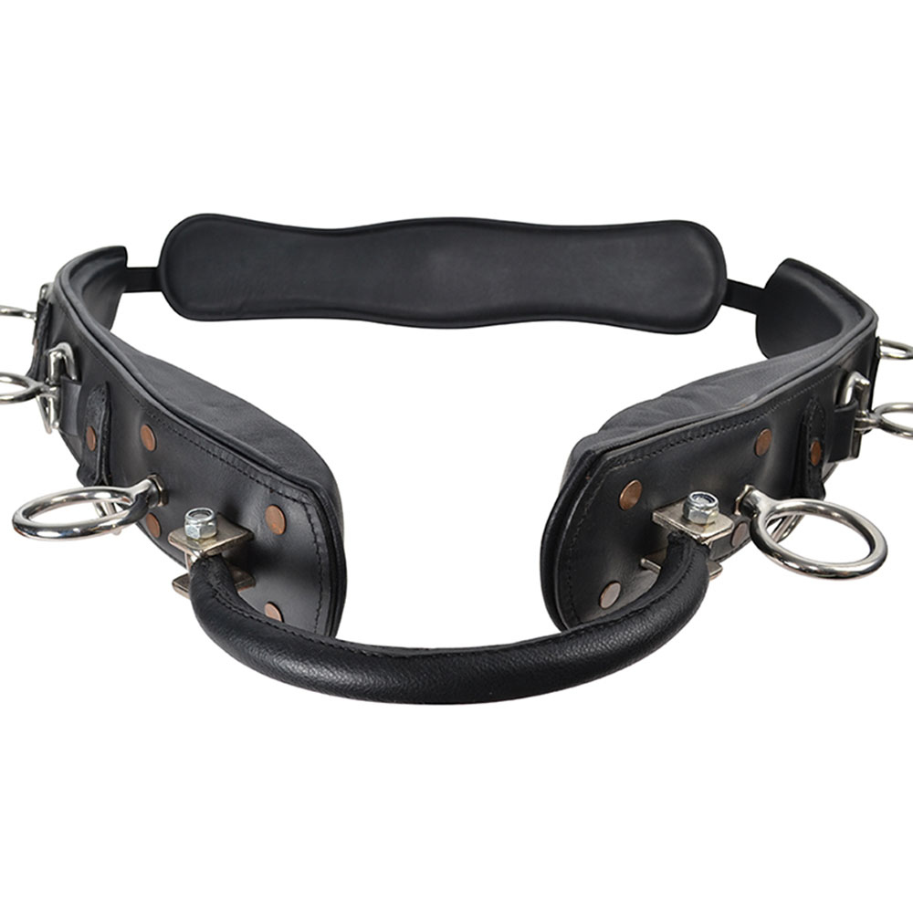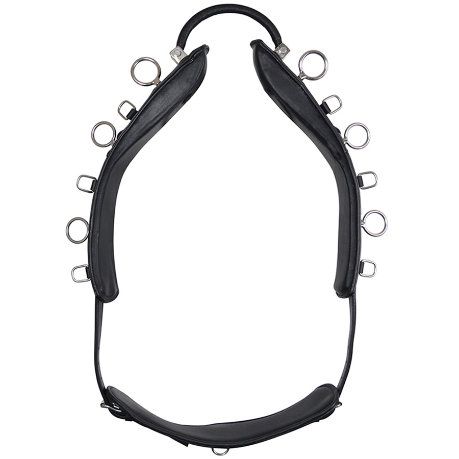 Model wyposażony jest w srebrne okucia oraz trzy pierścienie po każdej stronie, co daje wiele możliwości przypięcia wodzy pomocniczych i innych akcesoriów treningowych. Ruchomy (przegubowy) łuk ułatwia dopasowanie i pozwala lepiej ułożyć pas na grzbiecie konia.