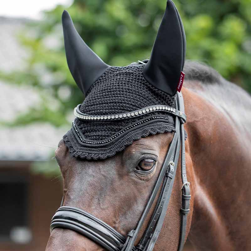 „Soundless” uszy wykonane są z wielu warstw tkaniny, w tym z gęstej mikro‑pianki, która absorbuje ostre dźwięki mogące zakłócać koncentrację konia. Wnętrze wyłożone jest miękkim bambusem, który redukuje tarcie i daje przyjemne uczucie na skórze. Wierzch wykonany jest z elastanu dla idealnego dopasowania. Dyskretna linia błyszczących kryształów wzdłuż przedniego paska nadaje wykończeniu elegancję.