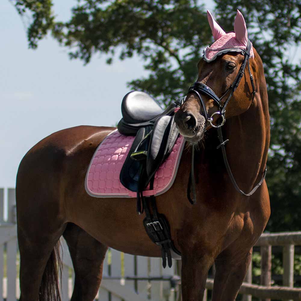 Urocze, szydełkowane nauszniki dla konia w kolorze różowym – idealne do stworzenia spójnego zestawu, np. w połączeniu z różowym czaprakiem QHP Florence. Świetny wybór dla osób, które lubią dopasowane, stylowe komplety dla swojego konia.