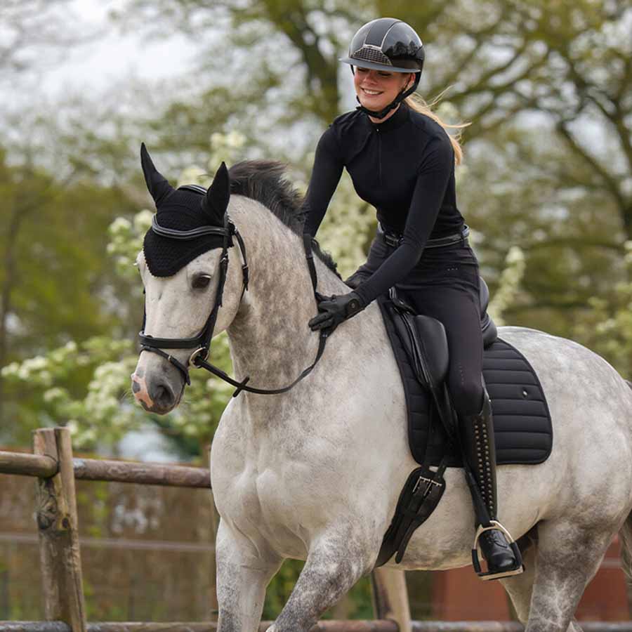 Nauszniki dla konia QHP Salerno to stylowy i funkcjonalny wybór dla Twojego konia. Te czarne nauszniki wykonane są w 100% z bawełny i posiadają elastyczne uszy z materiału softshell, co zapewnia wysoki poziom komfortu w połączeniu z delikatną tkaniną. Stylowy, szydełkowy design uzupełnia pętla z logo QHP z tyłu nauszników.