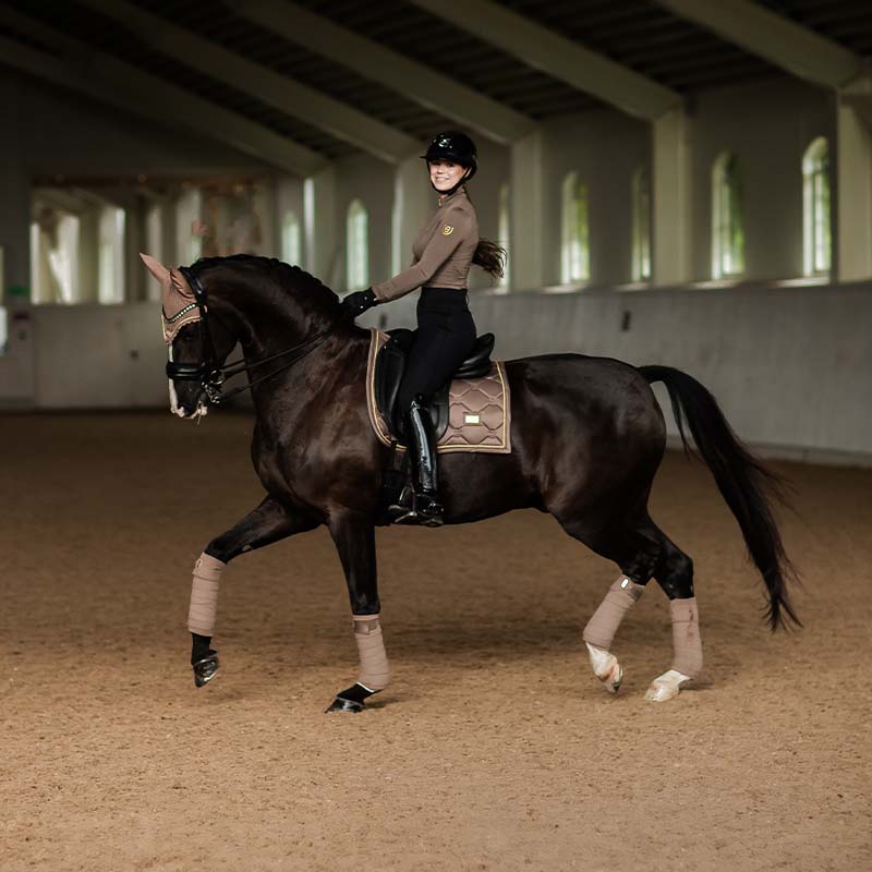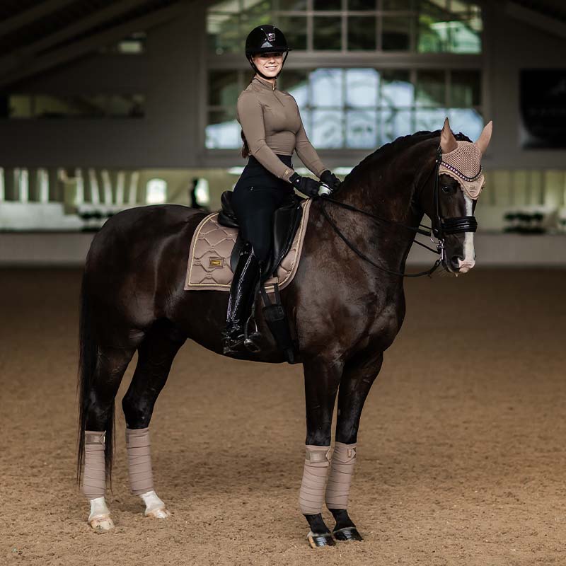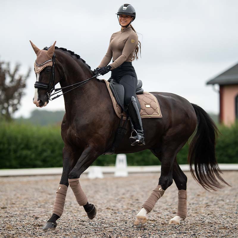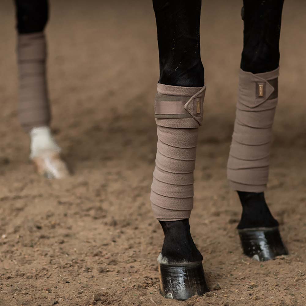 Nasze bandaże w pięknym beżowym champagne z złotymi detalami są zarówno stylowe, jak i funkcjonalne. Wykonane w 100% z nie-recyklingowanego poliestru, te bandaże polarowe zapewniają dobrą ochronę nóg twojego konia podczas treningu i zawodów. Łatwe do nałożenia i oferujące pewne dopasowanie, są doskonałym wyborem zarówno do codziennego użytku, jak i na bardziej formalne okazje. Połącz je z podkładką z naszej kolekcji Champagne, aby uzyskać spójny i elegancki wygląd. Każdy zestaw zawiera cztery bandaże, co czyni je praktycznymi i ekonomicznymi.
