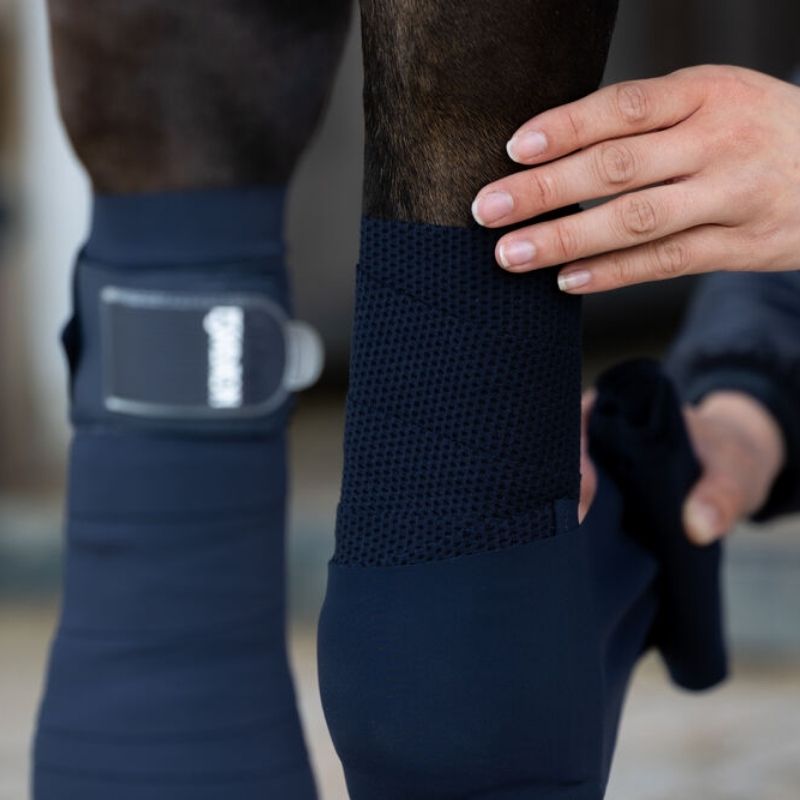 Owijki Softshell Mesh łączą softshell i siatkę, zapewniając wysoką oddychalność. Te granatowe owijki są dostępne w zestawie czterech sztuk i zapakowane w praktyczną torbę na zamek. Każda owijka ma wymiary 250 cm x 10,5 cm, co zapewnia dobrą dopasowanie i pokrycie.