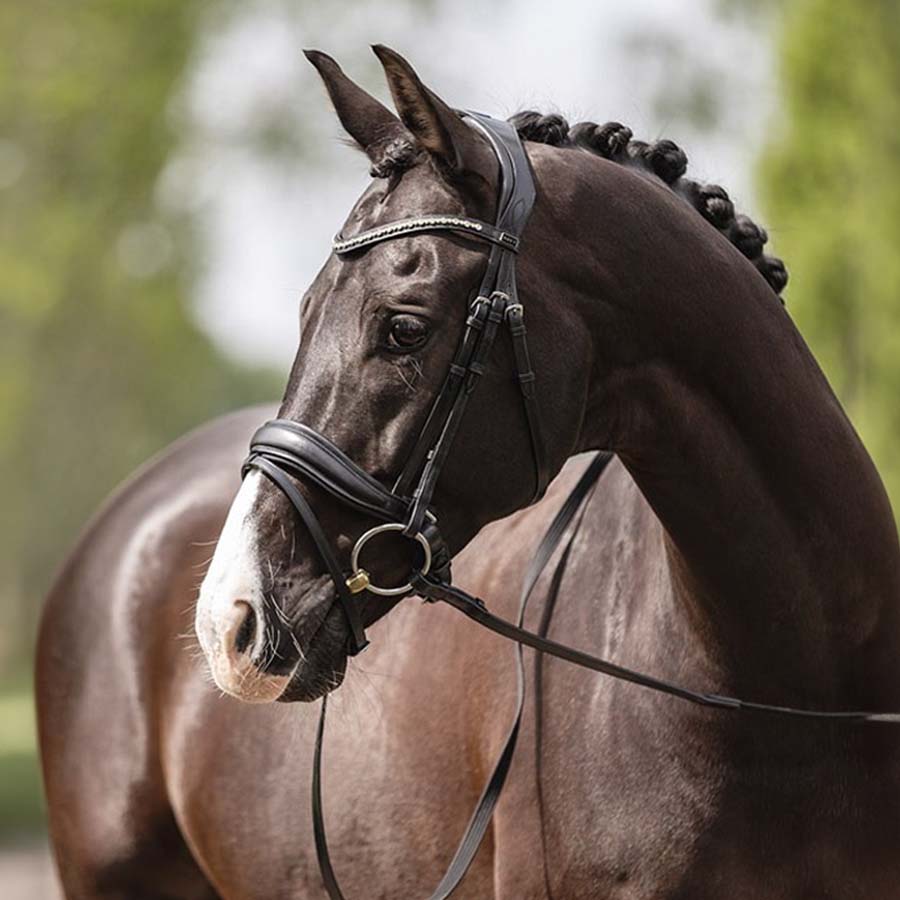 Elegancki charakter ogłowia podkreśla naczółek ozdobiony kryształami inspirowanymi Jet-Black Stellux z RPA, które nadają całości luksusowy wygląd. Model wyposażony jest w nachrapnik typu pull-back, srebrne okucia oraz dopasowane wodze z antypoślizgową powierzchnią.