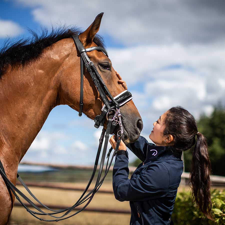 Całość uzupełniają srebrne sprzączki ze stali nierdzewnej oraz czarne przeszycia, które podkreślają elegancki charakter ogłowia.