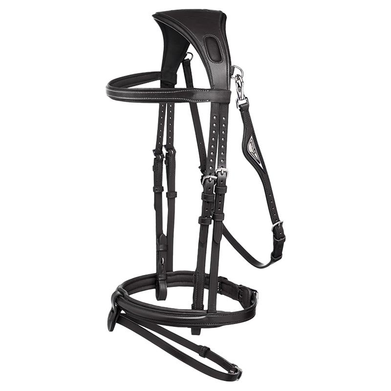 Szeroki pasek potyliczny równomiernie rozkłada nacisk na kark konia. Anatomiczny, miękko podszyty naczółek posiada innowacyjne, skośne mocowanie, które pomaga ograniczyć nacisk w okolicy uszu. Płaskie paski policzkowe są łatwe w regulacji, nachrapnik można całkowicie odpiąć, a pasek podgardlany z logo Equiline zapinany jest wygodnym szybkozapięciem.