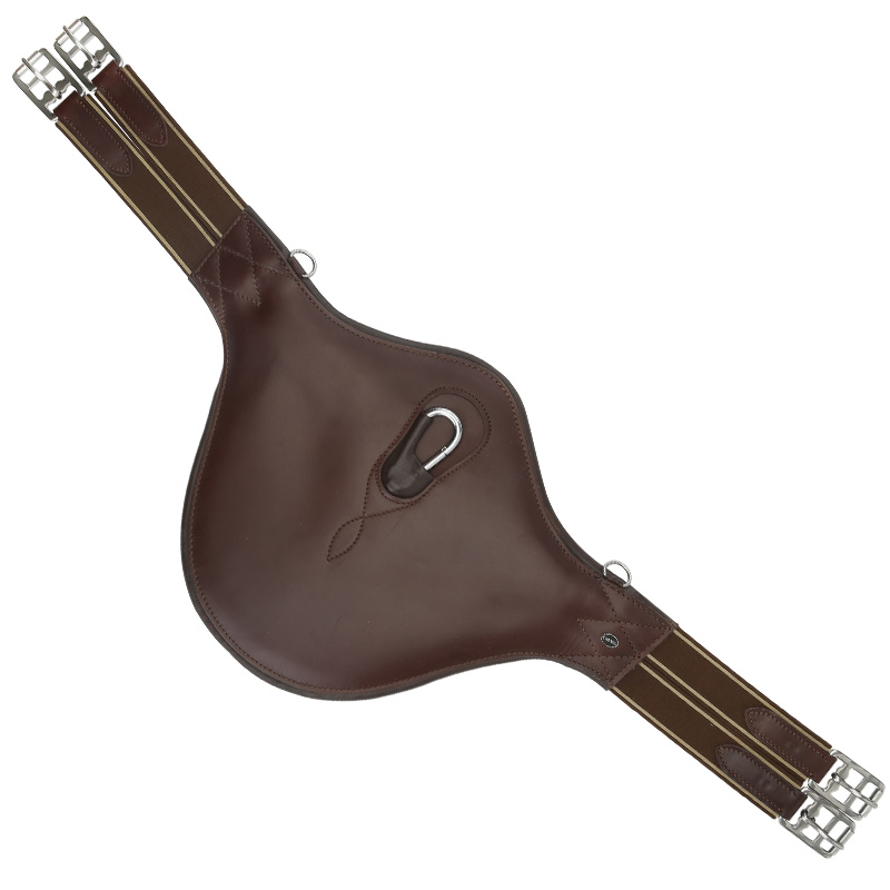 Fartuch skutecznie chroni brzuch konia przed uderzeniami kopyt i podków podczas skoków oraz jazdy w terenie. Popręg wyposażony jest w mocne elastyczne wstawki po obu stronach, które pomagają utrzymać siodło w stabilnej pozycji i zwiększają elastyczność. Model posiada dekoracyjne przeszycia, pierścienie D po bokach oraz karabińczyk w centralnej części fartucha do przypięcia pomocy treningowych.