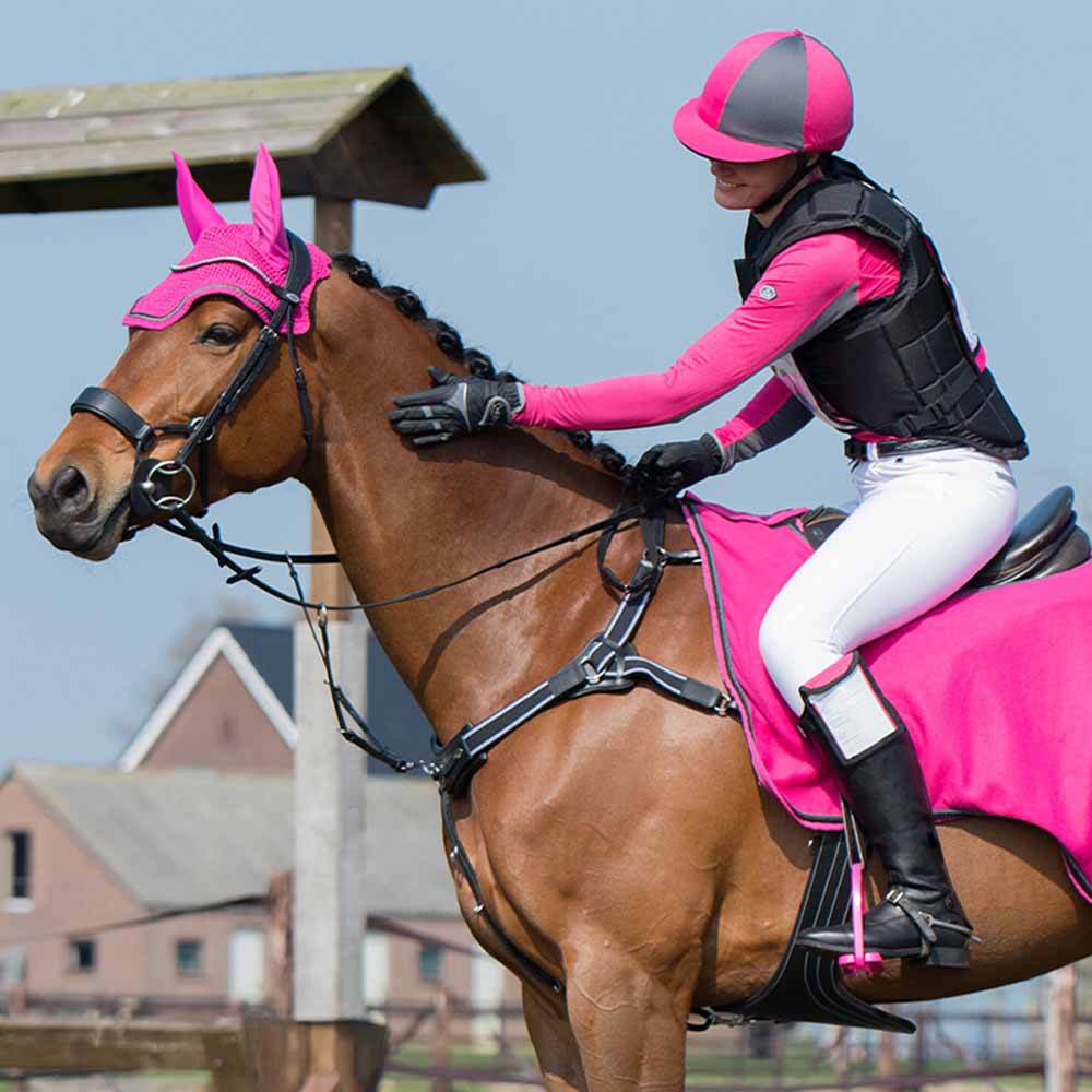 Fartuch chroni brzuch konia przed uderzeniami kopyt podczas skoków, dzięki czemu sprawdzi się zarówno podczas treningów, jak i zawodów. Model wyposażony jest w karabińczyk umieszczony z przodu fartucha, częściowo osłonięty skórą, co nadaje mu estetyczny wygląd podkreślony białymi przeszyciami. Elastyczne wstawki w dopasowanym kolorze po obu stronach ułatwiają zapinanie i zwiększają komfort użytkowania. Solidne klamry rolkowe umożliwiają łatwą regulację i zapewniają trwałość.