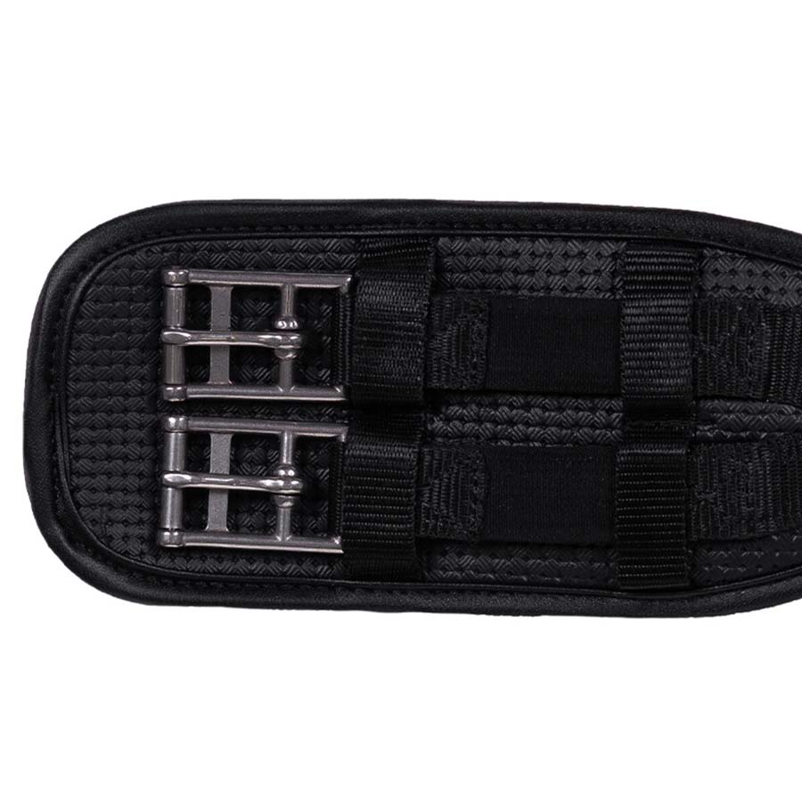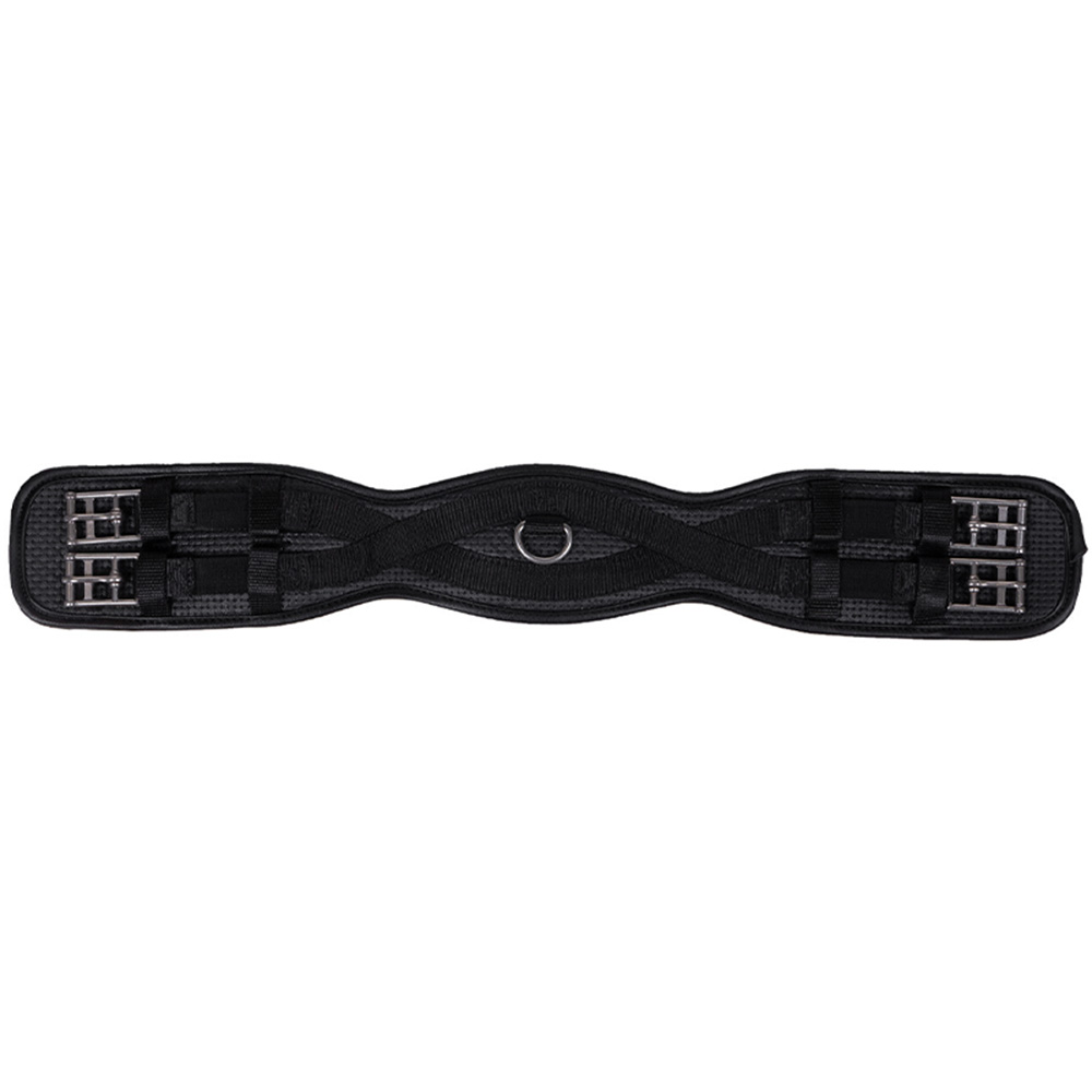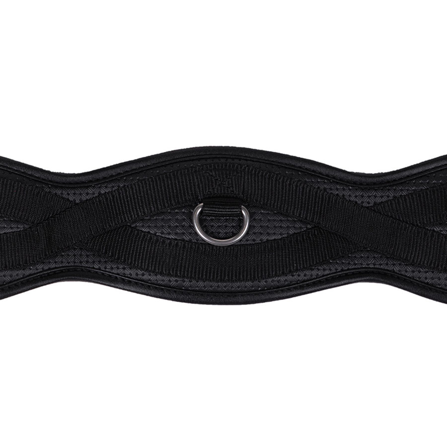 Czarny, anatomiczny popręg ujeżdżeniowy QHP, zaprojektowany, aby zapewnić koniowi większy komfort i swobodę ruchu. Popręg posiada elastyczne wstawki z obu stron oraz pierścień na spodzie do przypięcia wodzy pomocniczych. Model wyposażono również w rolkowe sprzączki ze stali nierdzewnej, które ułatwiają dociąganie popręgu.