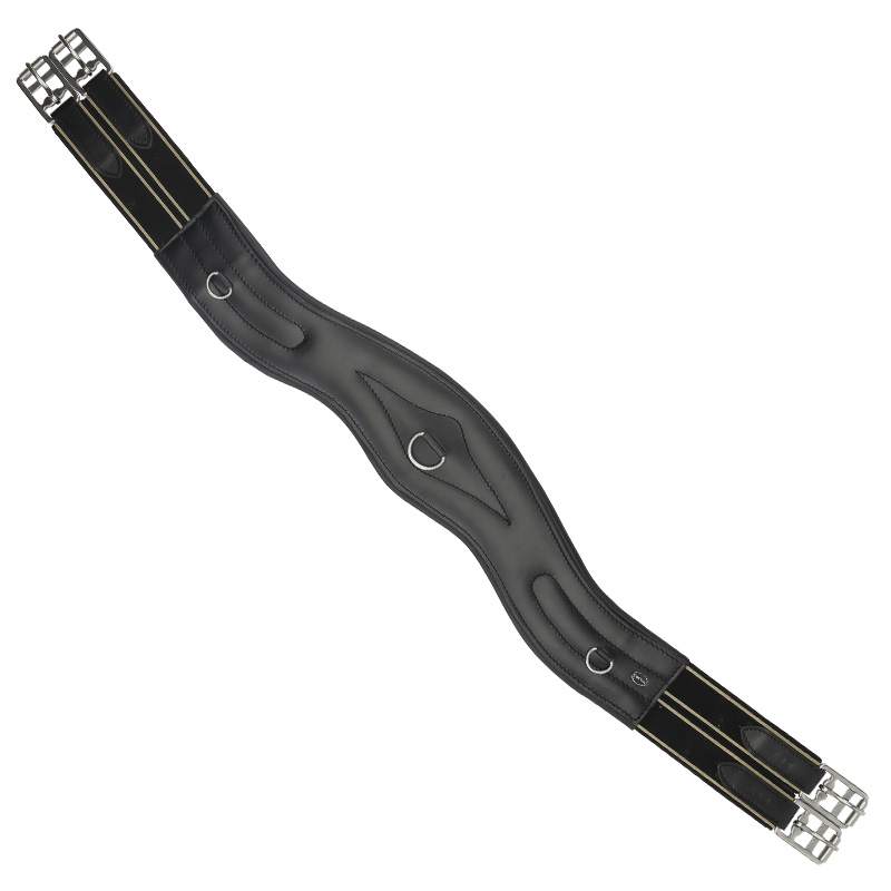 Miękkie podszycie sprawia, że popręg wygodnie przylega do brzucha konia i zwiększa swobodę ruchu. Po obu stronach znajdują się mocne elastyczne wstawki oraz klamry rolkowe ze stali nierdzewnej, które ułatwiają zapinanie. Model wyposażony jest także w trzy pierścienie D umożliwiające łatwe przypięcie pomocy treningowych.