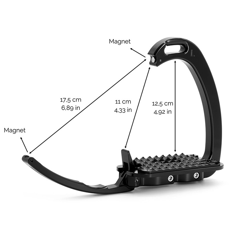 Model posiada magnetyczny mechanizm bezpieczeństwa – zewnętrzne ramię utrzymywane jest przez magnes, a w przypadku upadku, gdy stopa naciska na bok strzemienia, element odchyla się na zewnątrz, umożliwiając szybkie uwolnienie stopy. Po ustąpieniu nacisku ramię automatycznie wraca do pierwotnej pozycji.