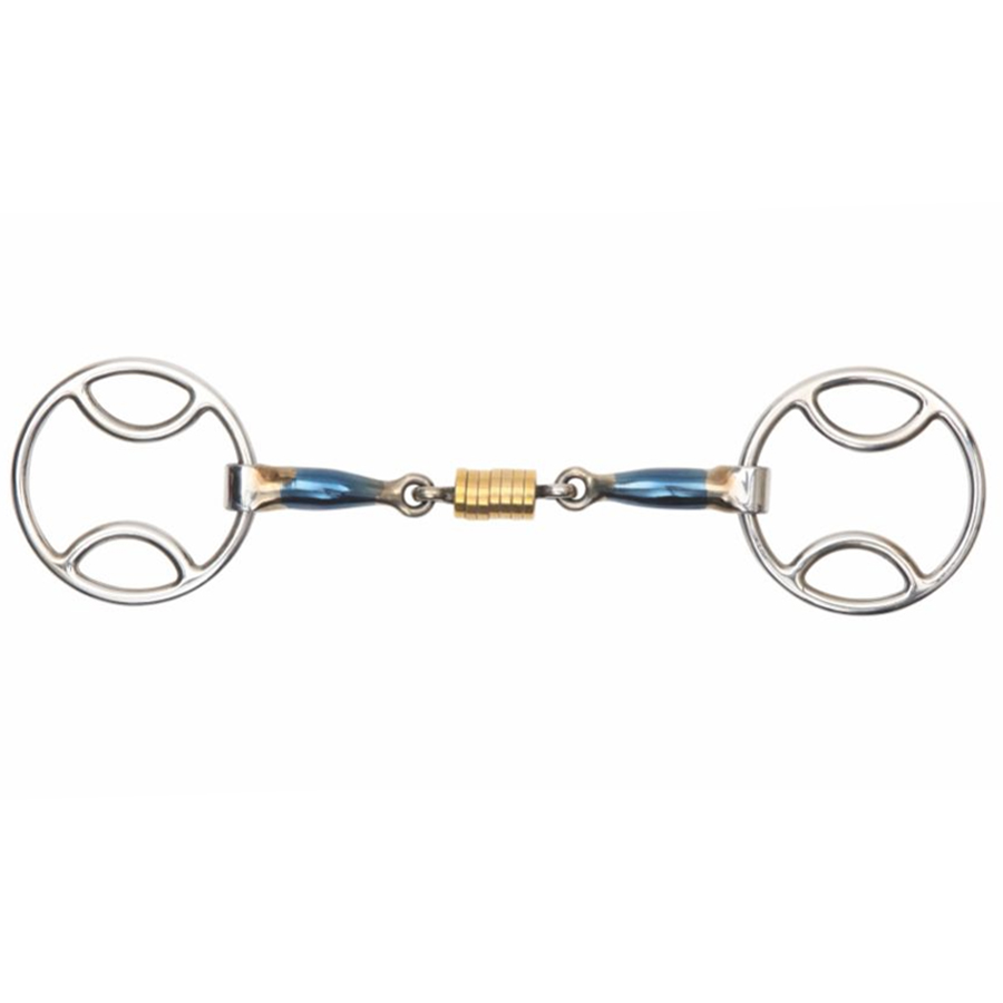 Środkowa część wędzidła została wyposażona w luźne mosiężne rolki, które zachęcają konia do żucia i pomagają skupić uwagę u bardziej wrażliwych lub niespokojnych koni.