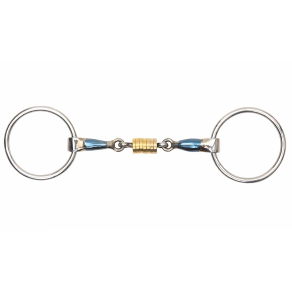 Wędzidło podwójnie łamane z luźnymi pierścieniami, wykonane ze stali nierdzewnej z ścięgierzem Blue Sweet Iron.