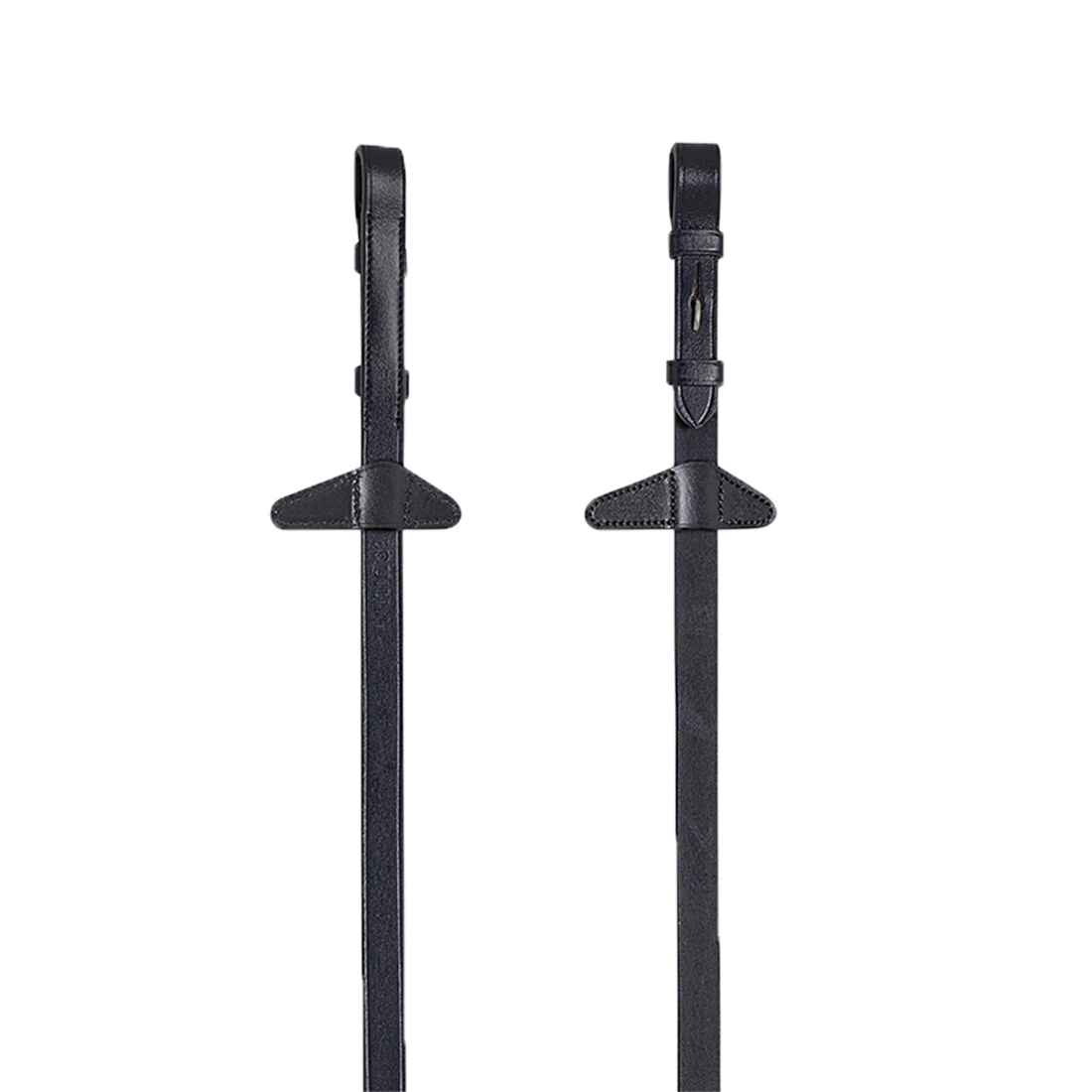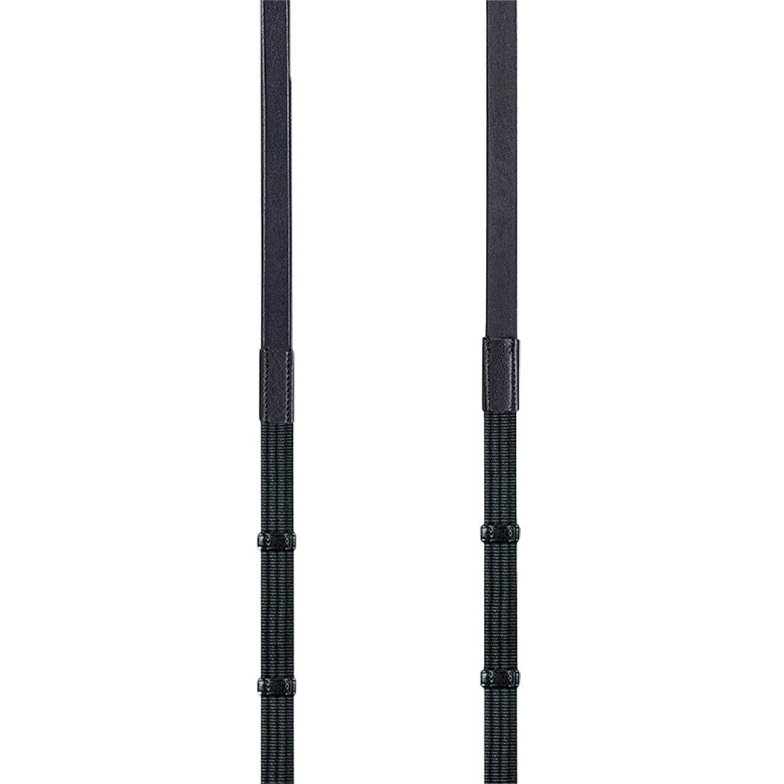 Czarne, klasyczne wodze parciane marki Equiline. Wyposażone w sześć skórzanych stoperów, które zapewniają pewny chwyt podczas jazdy.