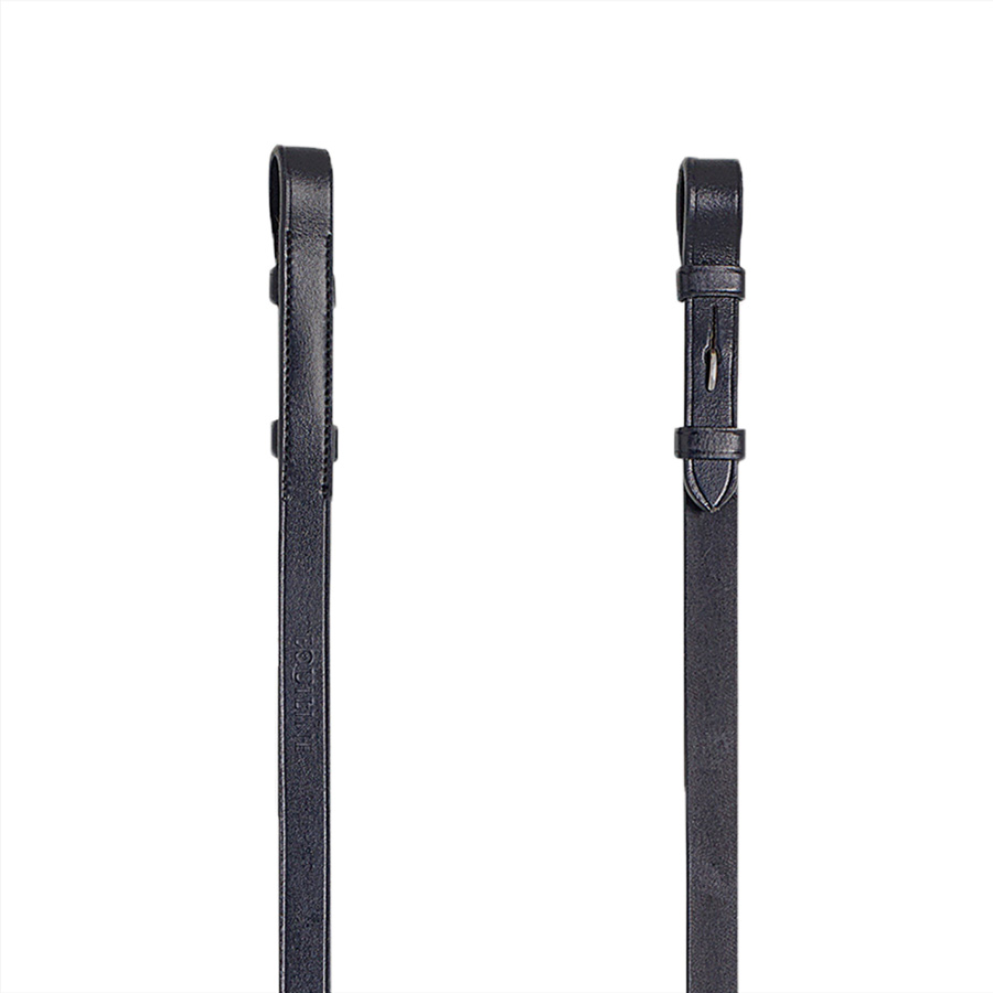 Czarne, eleganckie wodze Equiline z elastycznym rdzeniem gumowym, które zapewniają stabilny i pewny chwyt podczas jazdy. Model wyposażony jest w 6 skórzanych stoperów, pomagających utrzymać odpowiednią długość wodzy i poprawiających kontrolę. Wodze zapinane są na sprzączki skierowane do wewnątrz, co ułatwia ich szybkie przypięcie do wędzidła.