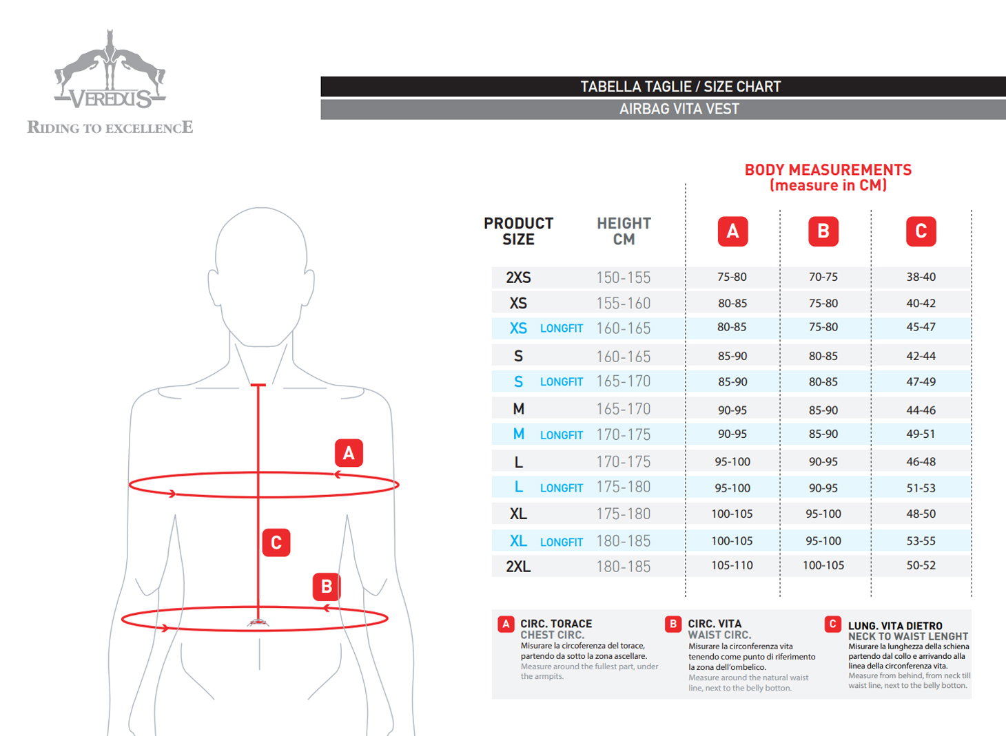 Aby kamizelka zapewniała maksymalną ochronę, musi być odpowiednio dopasowana. Użyj miarki i dokładnie postępuj zgodnie z tabelą rozmiarów, aby wybrać właściwy rozmiar dla swojego ciała. Kamizelka powinna przylegać (na odzież) bez uczucia dyskomfortu lub nadmiernego ucisku. Podczas jazdy powinna umożliwiać pełną swobodę ruchu, a kamizelka nie powinna uderzać w tylny łęk siodła. Wersje Standard i Long Fit pomagają zapewnić idealne dopasowanie dla każdego jeźdźca.