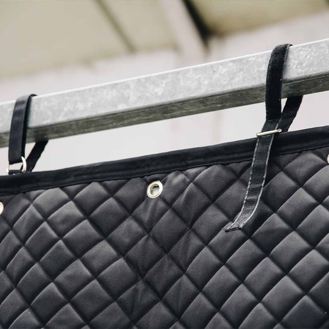 Czarna zasłona boksowa Kentucky o wysokiej jakości Waterproof zwiększa dobrostan konia, zapewniając mu zasłużony spokój w boksie. Zasłona boksowa, wyposażona w 5 ukrytych haków karabinkowych do zawieszania sprzętu i akcesoriów, łatwo wiesza się na ścianie boksu za pomocą 5 zintegrowanych, wzmocnionych pierścieni do wieszania. Luksusowy pikowany wzór, w połączeniu z dyskretnymi detalami w ekoskórze, nadaje również naprawdę ekskluzywny charakter.