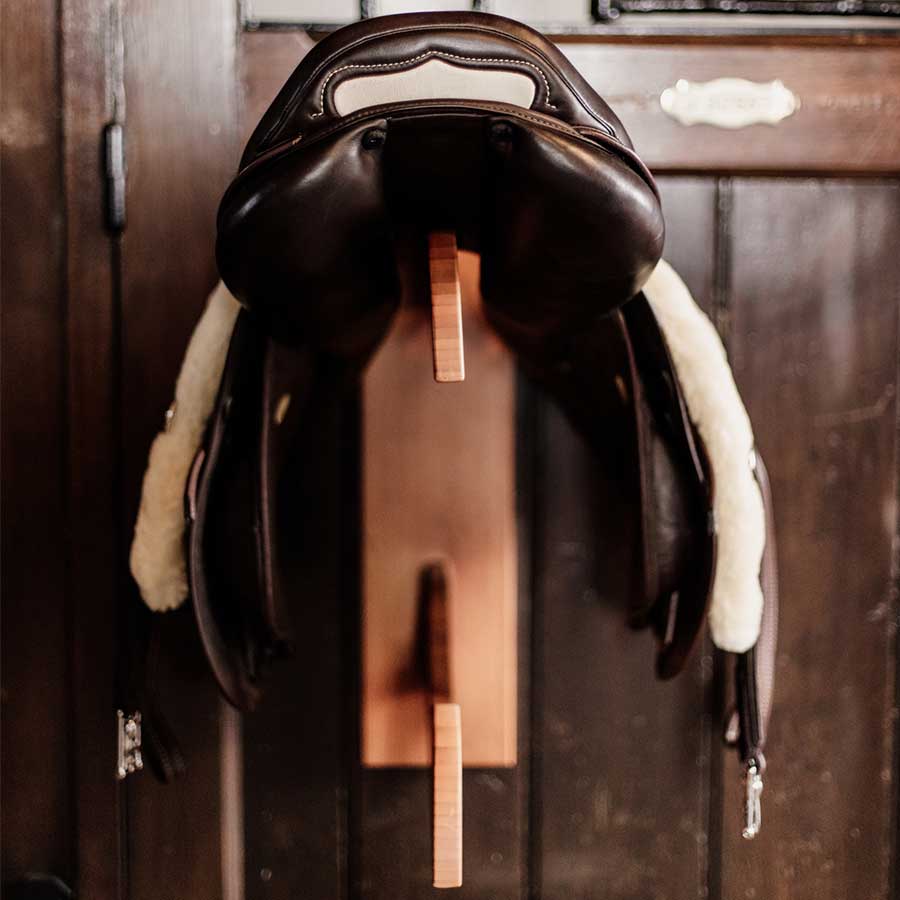 Elegancki wieszak na siodła z miejscem na dwa siodła, wykonany z bambusa dla większej trwałości i łatwego czyszczenia. Bardzo łatwo go powiesić wszędzie, dzięki dużemu hakowi z tyłu, co sprawia, że nadaje się zarówno do przejścia stajennego, jak i do pomieszczenia ze sprzętem, a także do boksu na zawody. Numer artykułu: