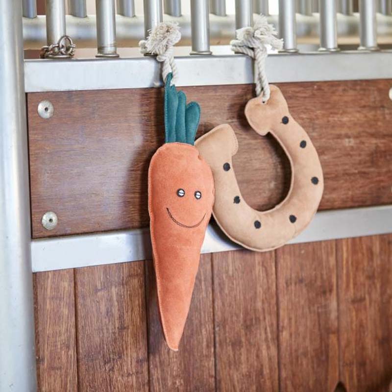 Wytrzymała i łatwa w użyciu zabawka dla koni z zamszu – zaprojektowana dla koni, które potrzebują czegoś, co je zabawi i wciągnie, aby uniknąć niepokoju, gdy na przykład znajdują się w boksie lub na padoku. Marchewka jest wyposażona w mocne liny, które sprawiają, że czas zabawy jest szczególnie przyjemny dla konia, a zawieszenie jej jest proste.