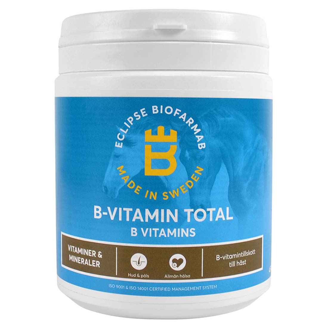 B-witaminy Total od Eclipse Biofarmab zawiera pięć najważniejszych witamin B dla koni w połączeniu z inuliną i drożdżami, które wspierają produkcję własnych witamin B u koni w jelicie.